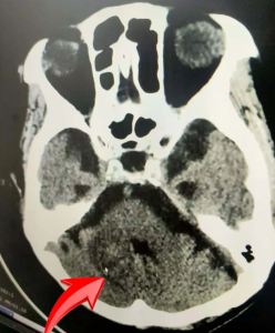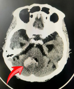 接诊医生向医生在经过了一天忙碌的工作之后,马上集中精神接诊该患者,在内二区唐婉莹主任的指导下,通过临床表现、查体体征结合既往史,考虑急性脑血管意外,立即联系影像科行头颅和胸部CT检查,确诊为急性脑出血同时合并肺部感染,并及时制定治疗方案。